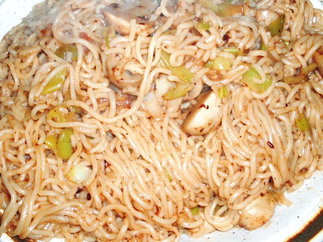 Noodles: Boil the noodles until soft. Fry some mushrooms flavoured with a little five spice. Add the noodles, stir in a little oyster sauce and some black bean paste.